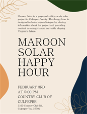 Maroon Solar is a proposed utility-scale solar project in Culpeper County. This happy hour is designed to foster open dialogue by sharing information about the project and providing context on energy issues currently shaping Virginia’s future.