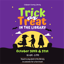 Kids in costume can visit any desk in the library to pick up a fun treat and enjoy a spook-tacular library adventure. Open to all kids and teens 0-18 years old.