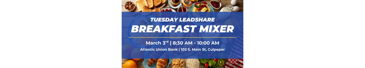Join us for the Tuesday Leadshare Breakfast Mixer on Tuesday, March 3rd, at 8:30 AM at the Main Street Atlantic Union Bank. Enjoy breakfast while meeting local professionals, learning how Leadshare works, and hearing about the benefits of joining both the Chamber and a Leadshare group.